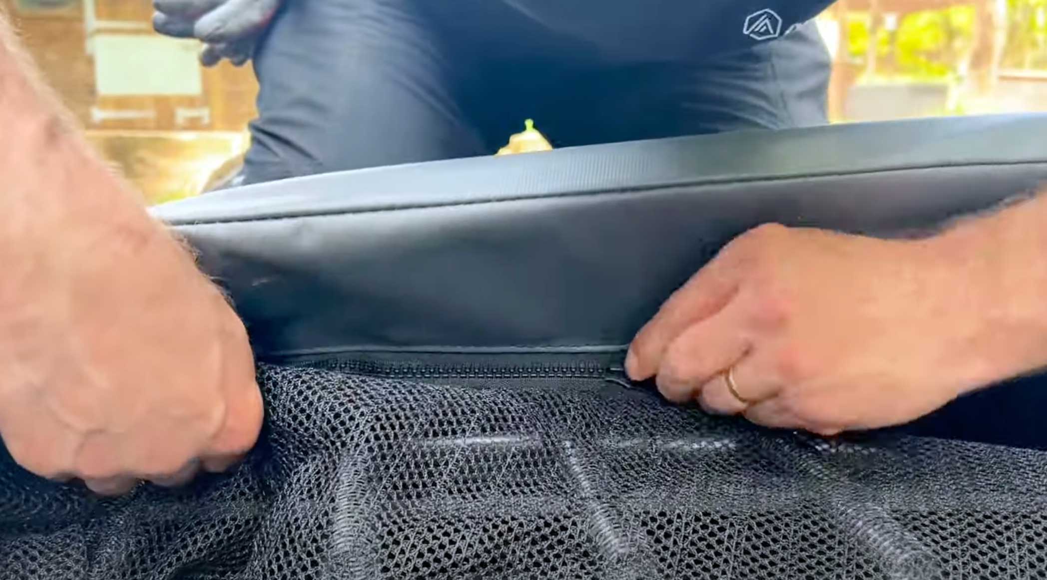 Use a long screwdriver to help push the elasticated toggles down between the trampoline frame and the retaining wall in order to secure the pads to the trampoline.
